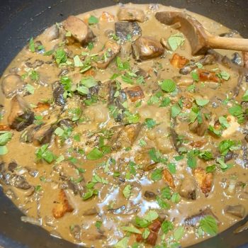 You definitely don't miss the meat with this hearty mushroom and halloumi stroganoff. Tasty, rich and creamy delicious served with either mash, rice, pasta or some crusty bread.